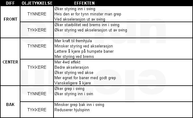 Bruger du buggyen til asfaltløb, så brug f.eks. vådrumssilikone i midten. Det hærder helt (24 timer) og kan fjernes, hvis det ønskes senere. Brug derefter 100.000 foran og 30.000 bagpå. Så får du en ren 4WD bil. Så brug også de hårdeste fjedre og sænk bilen så meget du kan. Køb asfaltdæk, buggydæk er ædt op efter 5 minutter på asfalt.