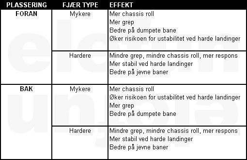 Fjedre er med til at bestemme, hvor meget af bilens vægt, der overføres til hjulet, og hvor hurtigt dæmperen vender tilbage til sit udgangspunkt. I den følgende tabel kan du se, hvad der sker med fjedrenes forskellige hårdheder.