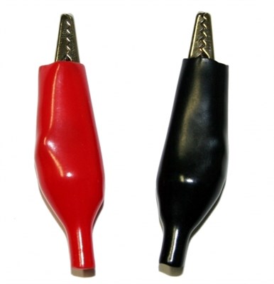 Store krokodilleklemmer. Leveres som et par med en rød og en sort.