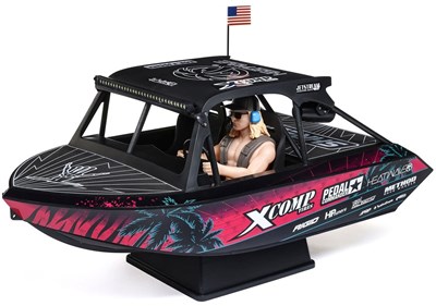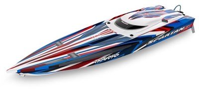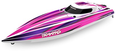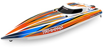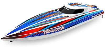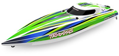 Kraftig elektrisk båd fra Traxxas, leveres med TSM og radioudstyr forudmonteret, båden kan køres med flere forskellige batterier, men med maksimal opsætning kan man overstige 80 km / t!