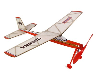 En traditionel model af balsatræ og silkepapir, drevet af elastikker, der efterligner et moderne lille fly. Perfekt til at lære grundlæggende konstruktionsmetoder og indstille flyveegenskaber. Modellen er en Cessna 180 med et vingefang på 450 mm. De