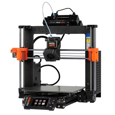 Prusa MK4S med MMU3 (Multi Material Upgrade). MMU3-enheden har fem filamentindgange. Ilæg op til fem farver efter eget valg, opdel modellen i PrusaSlicer, og start udskrivningen. Systemet vælger automatisk det korrekte filament ved hjælp af vælgeren