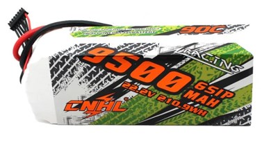 6s 9500mAh -90C - CNHL. Dimensionerne er 175x50x62mm og er perfekte til store biler, der kræver meget kraft og kapacitet. Leveres med XT90-stik og 90C-klassificering.