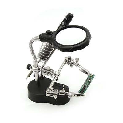 Praktisk loddeholder med forstørrelsesglas, lys, klip og loddebeslag. Gør jobbet betydeligt nemmere og sjovere.
