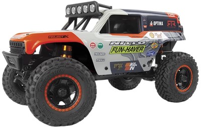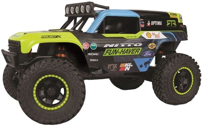 1/24-skala rockcrawler af en Ford Bronco med 4WD og gode cross-country evner. Hele kroppen kan vippes bagud og kræver ingen clips, hvilket giver dig nem adgang til elektronikken. Licenserede Nitto Trail Grappler M/T-dæk giver et robust udseende med