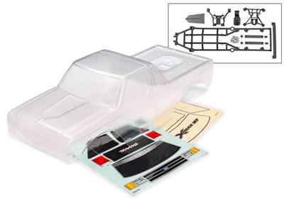TRX-8918 Maxx 4x4 Akselafstand (352mm) Body Clear leveres umalet, men med mærkater. Den indre og ydre del, der stivner kroppen, er ikke inkluderet.
