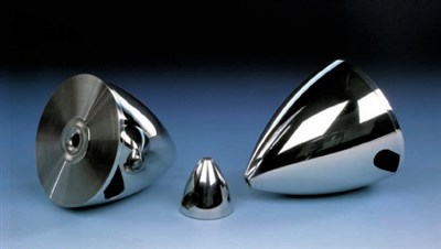 Spinner i nylon med aluminium bagplade og 5 adapterringe á 5, 6, 7, 8 og 10 mm. Finish i aluminium/krom-look.