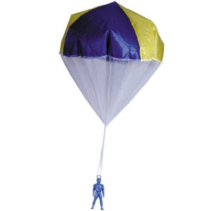 Sjove faldskærmsjumpere, der enten kan bruges som kastelegetøj eller til at falde fra et fly. Det geniale ved dette er, at her er der kun én tråd, der forhindrer faldskærmen i at filtre sig sammen. Øverst har du en stor stofskærm. I stedet for ledni