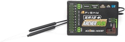 FrSky Archer Plus SR12 er en modtager med ACCES og ACCST D16 protokol, der også har en black-box funktion og nogle grundlæggende flydata. Modtageren har 12 porte/kanaler og leveres med 2x XT30 stik til modtagerbatteriet. Plus R12 har også SBUS-udgan