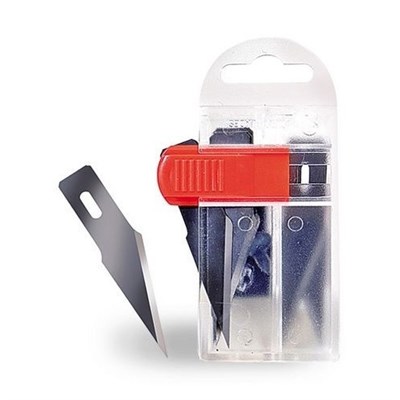 Sikkerhedsdispenser med 10 standard No5 bladblad. Sættet gør det mere sikkert at opbevare og, når det er opbrugt, kaster knivene uden risiko for at skære skader. Dispenseren giver dig mulighed for nemt at skubbe et og en ubrugt blad. Når et blad er