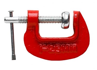 C-klemme med glat gevind stålskrue og fritspinende trykfordelingsspids.