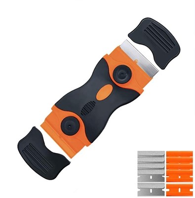 Skraber med to sider. En til et barberblad, og en til et plastikblad Plastbladene er perfekte til at løsne genstande fra byggepladen uden at beskadige overfladen med plastsiden, mens metalbladet kan bruges til mere krævende opgaver. Leveres med 10 e