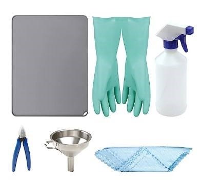 Rensesæt til harpikstryk. Den leveres med 1 silikonepude til underlag, tragt med filter, skraber, silikonehandsker, sprayflaske og 5 servietter.