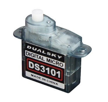 Dualsky digital mikroservo ved 3,7 g. Tåler 4.8V og leveres med 12 cm JR servokabel og to servohorn med fastgørelsesskrue.