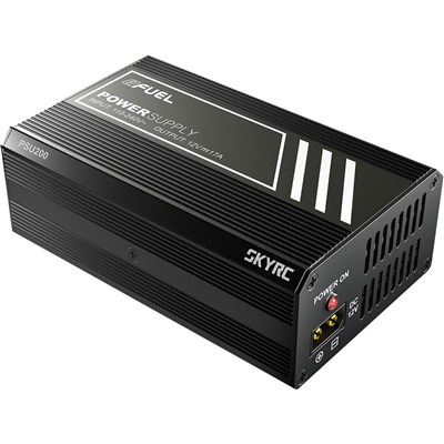Strømforsyning fra SkyRC, der leverer 12V max 17A, bruger standard 100-240v vekselstrømskilde. Strømforsyningen har et XT-60 stik, og et strømkabel er inkluderet for at tilslutte strømforsyningen til stikkontakten. Strømforsyningen passer til flere