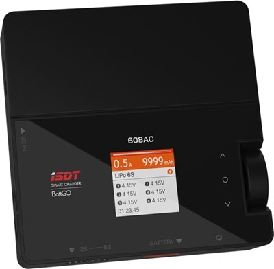 ISDT 608AC er en oplader med aftagelig strømforsyning. Opladeren fylder således meget lidt, når den bruges på en jævnstrømskilde (XT60). Opladeren yder 50W ved 220V og 200W ved 12V. Oplader 1-6S lipo op til 8A ladekraft. Leveres uden ladekabel (XT60