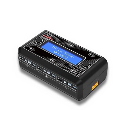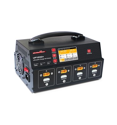Ultra-Power UP10 er en alt-i-én oplader til op til 10A/6S lipo med 2 kanaler, der kan bruges fra både 12V og 220V. Ved 12V indgang har du 100W effekt pr kanal, ved 220V indgang kan du fordele i alt 100W mellem de to kanaler. Farveskærm og micro-USB