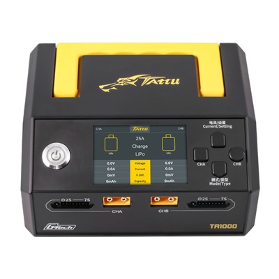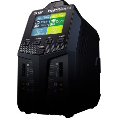SkyRC T1000 er et kraftcenter af en oplader med 2 separate opladningsudgange. Opladeren kan bruges på en 10-30V DC strømkilde og kan så producere i alt 1000w fordelt på 2 udgange. Når den bruges på en 220V AC strømkilde, producerer opladeren maksima