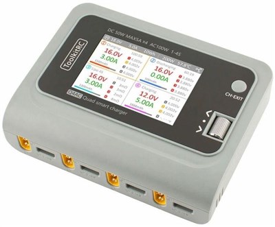 ToolkitRC her er et godt valg for dem, der ønsker at kunne oplade 4 batterier på samme tid og har masser af muligheder. Den kan bruges både på 220V derhjemme og på en 10-18V kilde såsom et bilbatteri eller lignende. Opladeren har en maksimal effekt