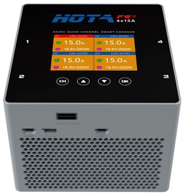 Hota her med en kraftig smart oplader! F6 har fire porte og kan oplade en lang række understøttede batterityper. Opladeren kan lade fra 0,1-15A på hver af portene. Understøtter opladning af 1-6S LiPo/LiHv/LiFe/NiHm for at nævne nogle få af batterity