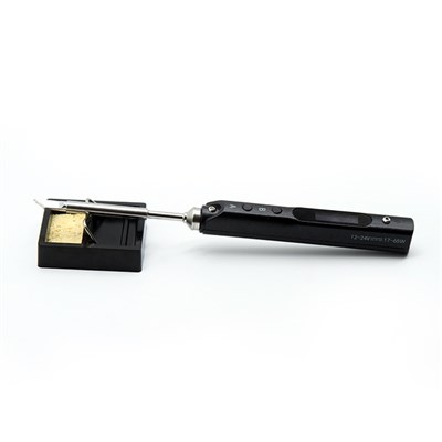 Sequre D60A er en lille, men kraftig loddemaskine. Kræver 12-24V via USB-C og kabel til tilslutning af batteri med XT60-stik inkluderet. Strømforsyning kan købes separat. Loddetang justeres via et 3-LED display. Ved 12V får du 17W strøm og når 300 g
