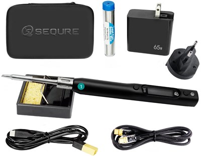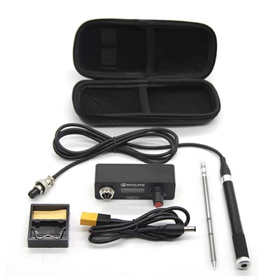 Sequre SQ-001 er en lille, men kraftig loddemaskine. Kræver 12-24V input og kabel til tilslutning af batteri med XT60 stik inkluderet. Strømforsyning kan købes separat. Loddejernet justeres digitalt via OLED-skærmen og er også programmerbar og opgra