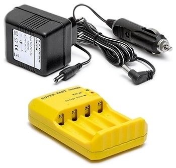 HopWo-batterioplader til 4x AA / AAA NiMh-batterier, opladeren leveres med både en almindelig stikkontakt (220V) og cigarettænderkontakt (12V).