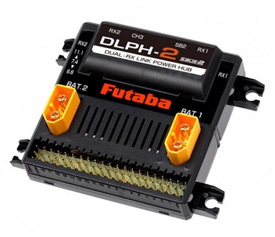 Futaba DLPH-2 - Dual RX Link Power Hub. Udstyret med 2 MAX60A systemer! Dual RX power hub. Ideel til fly, der bruger mange servoer, såsom store maskiner! Understøttelse af enkeltmodtagertilstand, gyrotilstand og FASSTest 26ch.