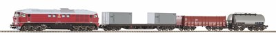 Komplet startsæt med tog, skinner, batterier og trådløs styring. Togsættet indeholder et Henschel klasse DHG 300B lokomotiv med 3 vogne. Medfølgende skinner giver et cirkulært spor på 130 x 76 cm med elektrisk sporskifter. Sættet leveres med C-skinn
