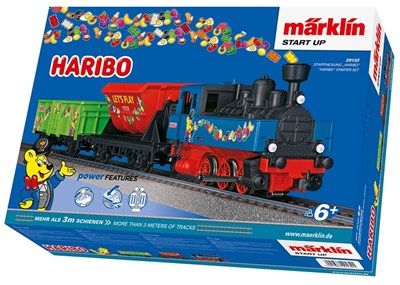 Komplet startsæt med tog, skinner, batterier og trådløs styring. Togsættet indeholder ét fiktivt godstog i farverigt Haribo design med 2 vogne. Medfølgende skinner giver et cirkulært spor på 112 x 76 cm med elektrisk sporskifter. Sættet leveres med