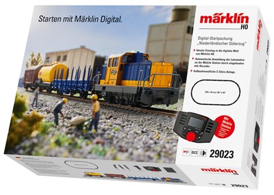 Komplet startsæt med tog, skinner, batterier og trådløs styring. Togsættet indeholder et godstog bestående af et elektrisk lokomotiv med 2 vogne. De medfølgende skinner giver et cirkulært spor på 190 x 85 cm med sporskifter. Sættet leveres med Märkl
