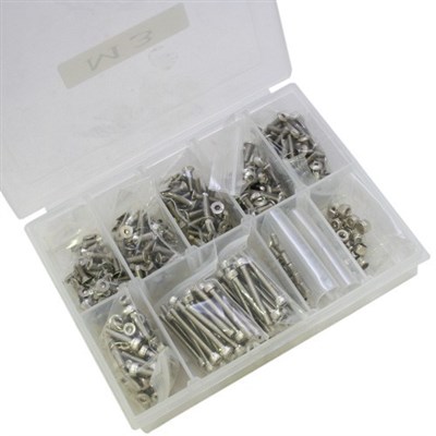 Skruesæt indeholdende 290 skruer / møtrikker. Leveres i en dejlig kasse med separate værelser. Skruerne er lavet af den bedste kvalitet i rustfrit stål.