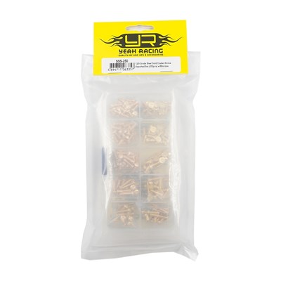 Yeah Racing Grade Steel 12.9 Assorted Gold Screws indeholder 250 guldfarvede stålskruer. Skruerne kommer med forskellige dimensioner og hoveder. Leveres i praktisk plastikæske.