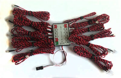 Stort belysningssystem til modelfly med 14 lysdioder. 9 fælles 2 store 3 små. De to store og en regelmæssig klar LED-blitz dobbelt blitz. Derudover er der to røde, langsomme enkelt blink. To hvide lys tændes kontinuerligt. Derudover har du fem hvide