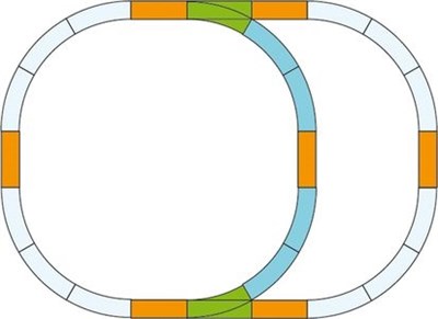 Skinnesæt med 12 R5 gynger i G-skala. Radius 1243mm, 15 grader. 24stk. er nødvendigt for at oprette en komplet cirkel.