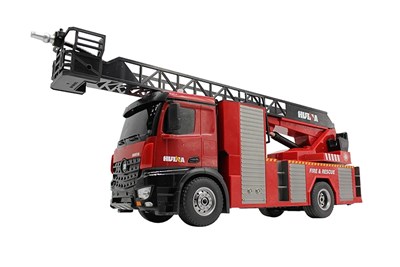 Brandbil i skala 1:14 med funktionel stige og vandslange. Modellen kører fremad / bagud og drejer til højre / venstre. Stigen kan hæves til en højde på 60 cm og rotere 270 grader. Modellen har også lys og lyd. Så sjovt for voksne som børn. Maskinen