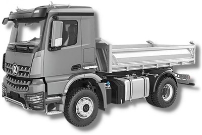 Komplet lastbil i skala 1:14 med metalplatform og kabine og 14 funktioner. Modellen kører fremad/bagud med firehjulstræk og drejer til højre/venstre og har skalalignende kipning af ladet. Modellen har også lys og lyde ud over en detaljeret førerkabi