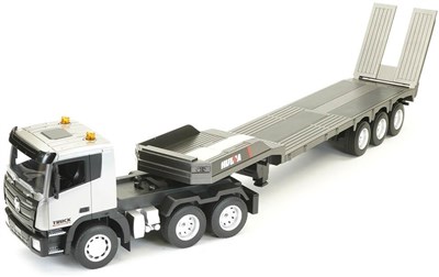 Simuler transport af gods eller maskineri med denne lastbil og fladvogn i størrelsen 1:18 fra Huina. Ladet er monteret separat på hovedkabinen. Bagklappen kan hæves og sænkes manuelt for nem læsning. En one-touch-knap på senderen giver simulerede ly