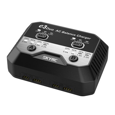 Enkel afbalanceringslader fra SkyRC som kan oplade LiPo-batterier på 2 og 3 celler, som har XH-afbalanceringsstik. Opladeren lader et 2S LiPo på 1.5A og et 3S LiPo på 1,0A. Opladeren kan kun lade et batteri ad gangen. Opladeren sættes direkte i vægk