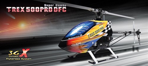 T-Rex 500 elektro med flybarless-hode og elektronikk. Nå leveres modellen med DFC-rotorhode som gir lavere tyngdepunkt og dermed mulighet for raskere respons. Helikopteret blie levert med 3xDS515 metallgirs swashservoer, 3GX flybarless-enhet med digital haleservo, børsteløs motor og regulator samt karbonblader. Helikopteret er primert av metall og karbon så her er det meste ferdig oppgradert ut av eska.