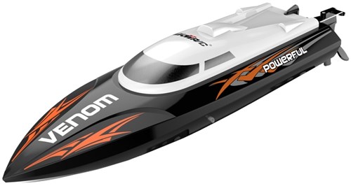 Den medfølgende radio er en standard størrelse pistolradio med komfortabelt skumgreb. Radioen tilbyder en rækkevidde på 150 meter, hvilket er mere end nok til en sådan båd. I modsætning til mange både i denne prisklasse er Venom udstyret med et servostyring. Derefter får du nøjagtig kontrol af båden, hvilket gør det meget sjovt at køre. Båden er udstyret med en omvendt funktion, der gør det nemmere, hvis du sidder fast i et brygnings hjørne.BMID
