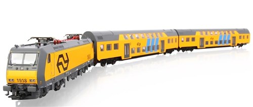 Komplet startpakke med tog, skinner og transformatorer. Togsættet indeholder en E-lokomotiv med to dobbeltdækkende personbiler i skala H0 (1:87). De inkluderede skinner giver en stor oval bane med alternative riller. En perfekt start til at komme i gang på en modeljernbane.