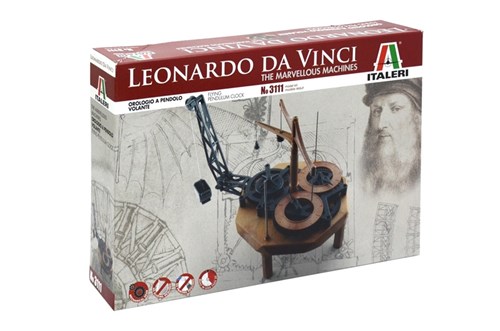 Arbejdsmodel af et Leonardo Da Vinci-pendelur. Modellen skal monteres, men der kræves hverken lim eller maling. Størrelse 22 cm.