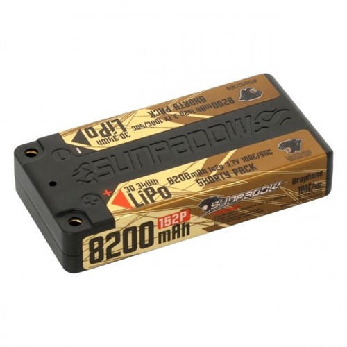 Sunpadow 1S 8200mAh 50C / 100C burst. Hardcase lipo pack med høj C rating, som giver god ydeevne til både løb og hobbybrug. Bruges ofte i 1/12 skala biler.