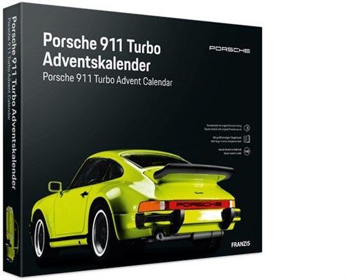 Adventskalender med konstruktionssæt af en Porsche 911 Turbo 1975 model i 1/43 skala. 24 luger, der gør ventetiden til juleaften hurtigere end en 911 Turbo bruger på 0-100!