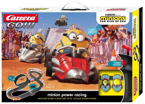 Wild times on the Carrera racing circuit!The new Carrera GO!!! Minion Power Racing set allows the yellow Minions to flash around the 4.9-metre racetrack. Out on the circuit, the two buddies, Otto and Stuart, challenge each other around a course with a loop and a narrow section. Be the fastest, and the first to cross the line!