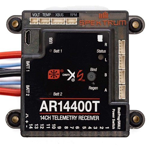 14-kanals redundansmodtager med mulighed for tilslutning af 2 modtagerbatterier. Lavet til større modelfly, hvor servoer trækker meget strøm. Integreret elmåler og telemetri, der kan kommunikere med Spektrum Smart-sendere.