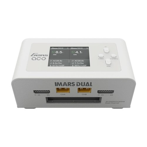 Gens Ace Imars Dual er en dobbelt computeroplader, der kan bruge batterier med XT60 direkte i opladeren. Boksen leveres med overgang til EC5, Deans og EC3-type stik. Den kommer også med en strømledning, USB-kabel og balancering til forskellige typer batterier.