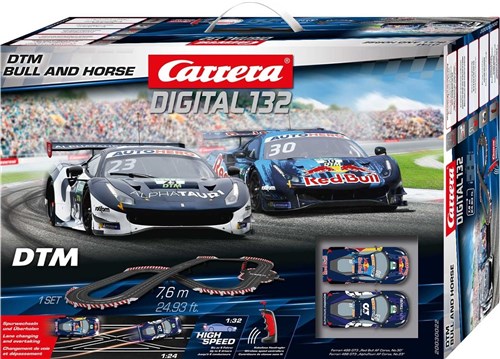 Digital bilbane i 1:32 skala med 2 DTM biler, Ferrari 488 GT3 "AlphaTauri AF Corse og Ferrari 488 GT3" Red Bull AF Corse. Sporlængde på 7,6 meter med bro og skiftespor. De digitale bilbaner fra Carrera giver dig mulighed for at skifte vognbane med et tryk på en knap til vilde overhalinger og neglebidende løb rundt på banen, her skal du have smart taktik. Alt dette gøres via de medfølgende trådløse håndbetjeninger!