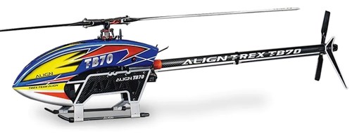 Align T-Rex TB70 er udstyret med et kraftigt drev og to-bladet halerotor, stel i 3K carbon, redesignet landingsskid som er let og holdbart og ikke mindst justerbar haledrivrem som er let og utrolig stærk! Batterierne er monteret på en skinne, der glider ind i kulstofhuset, og den medfølgende elektronik følger samme høje standard.